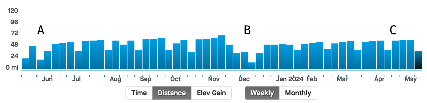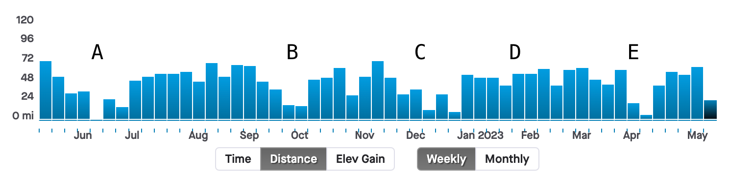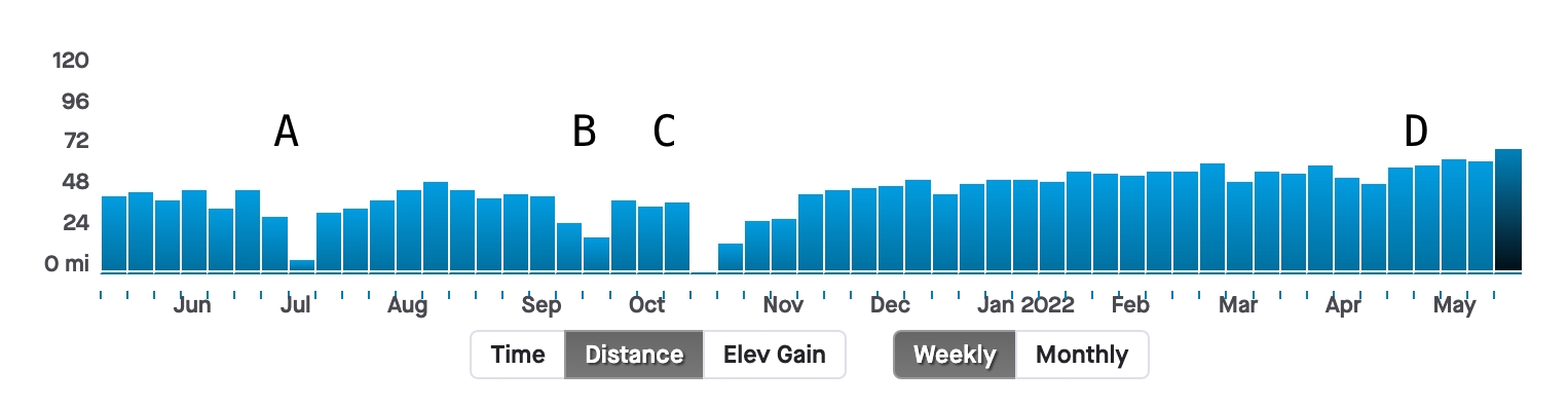 D. May 2022 - I put together about 6 months of never dropping below 45 miles in a week. I was consistent. I had a great half marathon race in April where I broke 1:40, which made me think I was on the right track. But, I was running my workouts too fast and not recovering. I over estimated my fitness, which bit me in my next marathon.