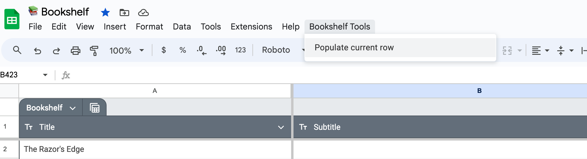 What's that? You don't like typing data into a spreadsheet? Just build a custom script to query the Google Books API for the info you find most annoying to type. I find I have to double check the publication year because the script arbitrarily picks the first book returned by the api.