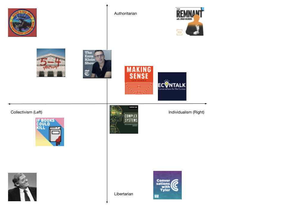 I plotted the political podcasts I listened to this month along two axis, Authoritarian - Libertarian and Collectivism - Individualism. We can think of this exercise as my podcast political fingerprint. Now obviously I like and agree with some of these podcasts more than others, but just as I attempt to read widely so too do I work to find diverse political voices in my podcast diet.