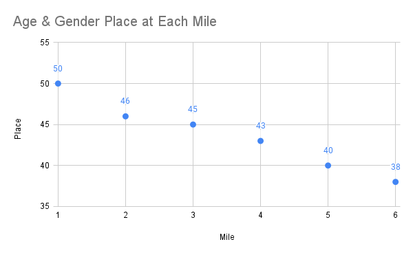 The next two miles were about keeping an even effort. That meant I slowed down on the hills, but so did my competition. At the end of the 3rd mile I was getting faster and had moved up to 46th place.