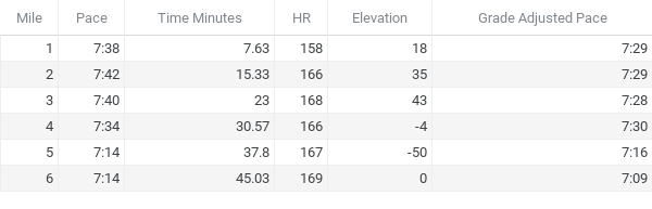 My first mile I intended to run in 7 minutes and 30 seconds. I ended up running it in 7:38 because I noticed that my heart rate was a bit high. I really wanted to be at ~160 and climb steadily over the course of the race as I sped up. Going out I was closer to 165 so I had to pump the breaks to bring my HR down. At the end of the first mile I was in 50th place amongst my soon-to-be-40 brethren.