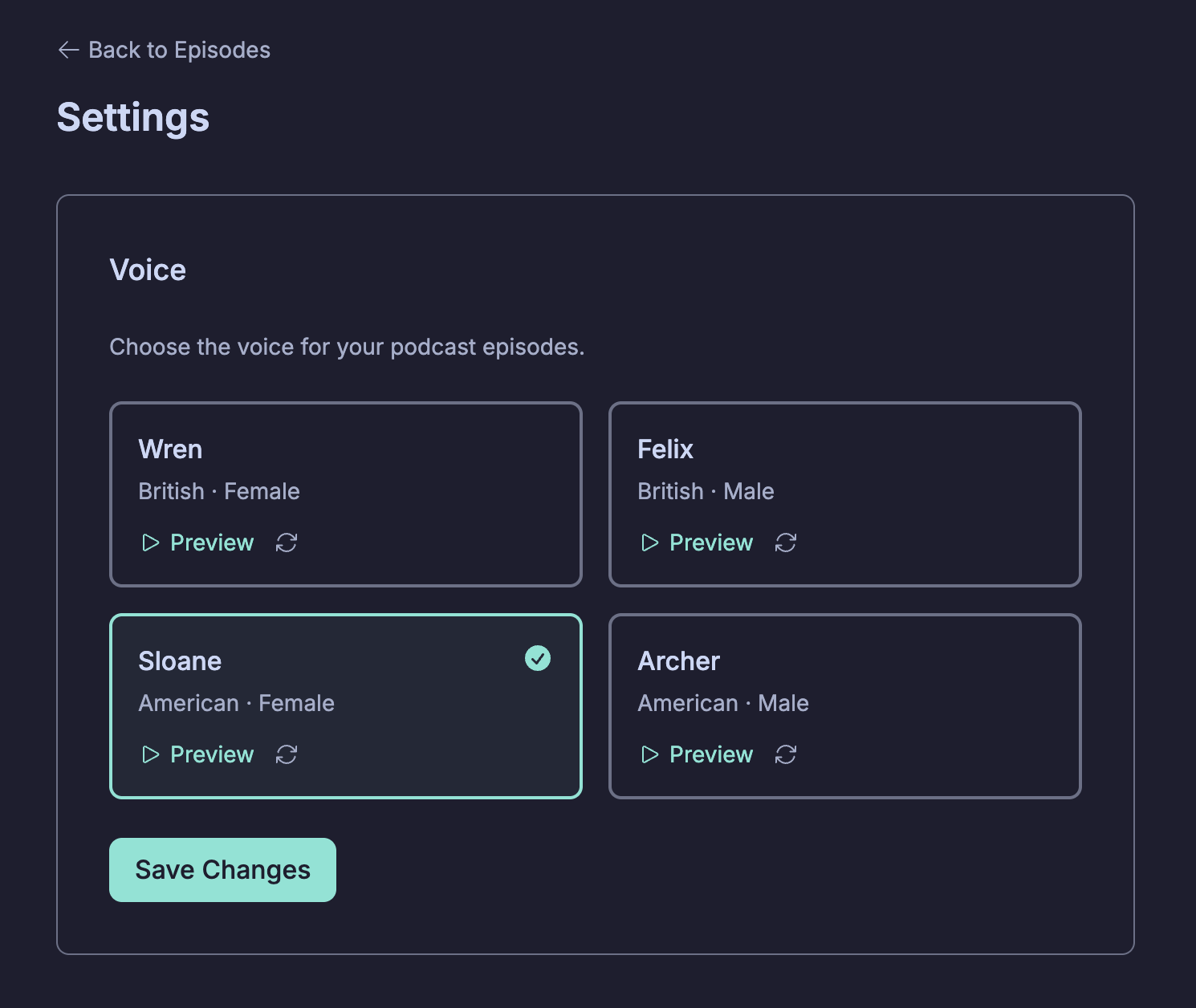 Next, select one of the four available voices and click "Save Changes." Your next episode submission will be read in whichever voice you select. Fear not, this is not a trapdoor decision. If you are sick of Felix's haughtiness, try the motherly Sloane for your next episode.