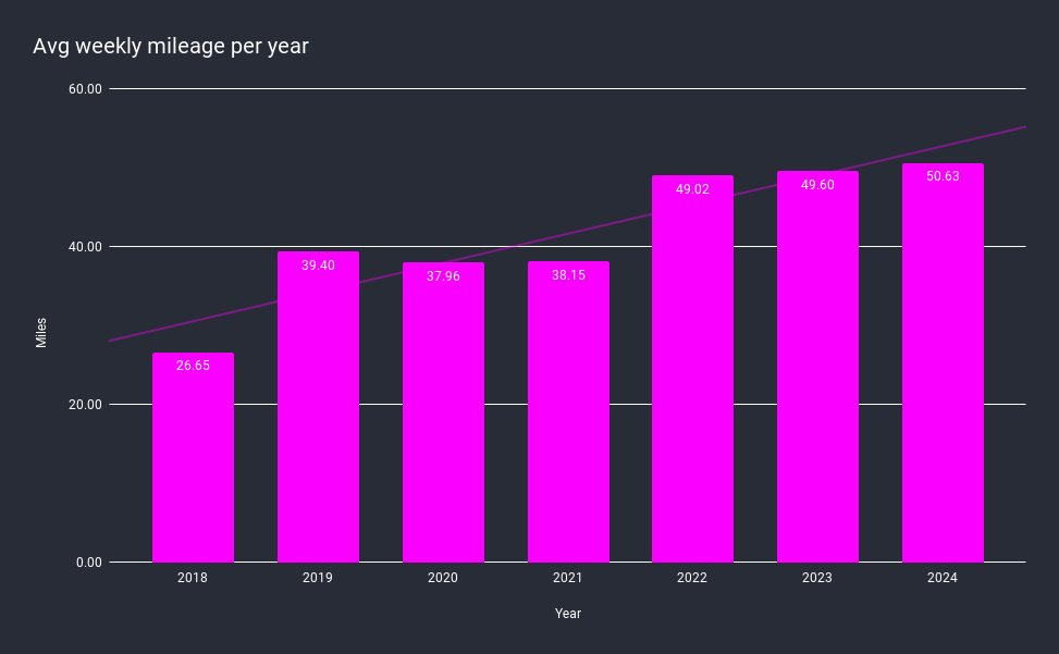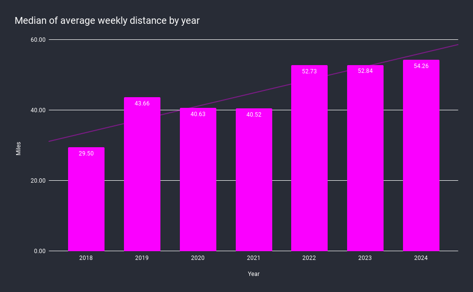 Looking at the median of my average weekly distance hints at an even larger load increase this year. Median is useful because it eliminates some of the more aberrant weeks resulting from racing, illness, and other circumstances.