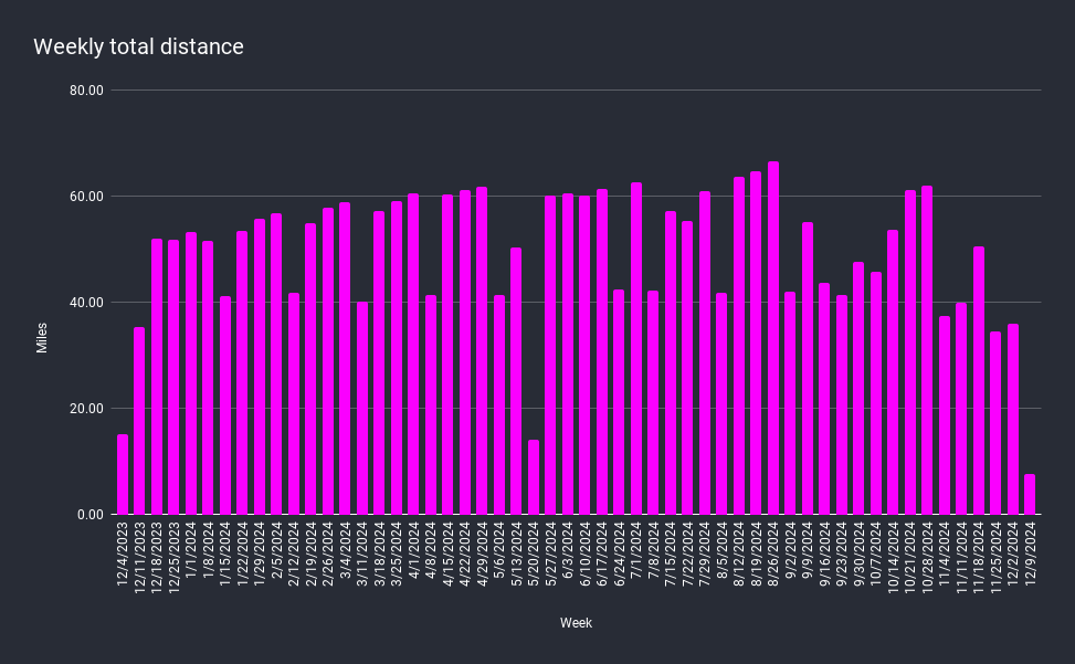 It is also likely that I need to adjust my weekly load. In 2024 I averaged almost 51 miles per week. The previous two years, with stronger CIM performances, I averaged 49-50 miles per week. In other words, for the past three years my average weekly milages has been very consistent. But, 2024 I introduced weight lifting twice a week. While the additional load does not show up in the graph, it does show up on my body. More than likely I was over-training. Over training leads to injury and can degrade the immune system.