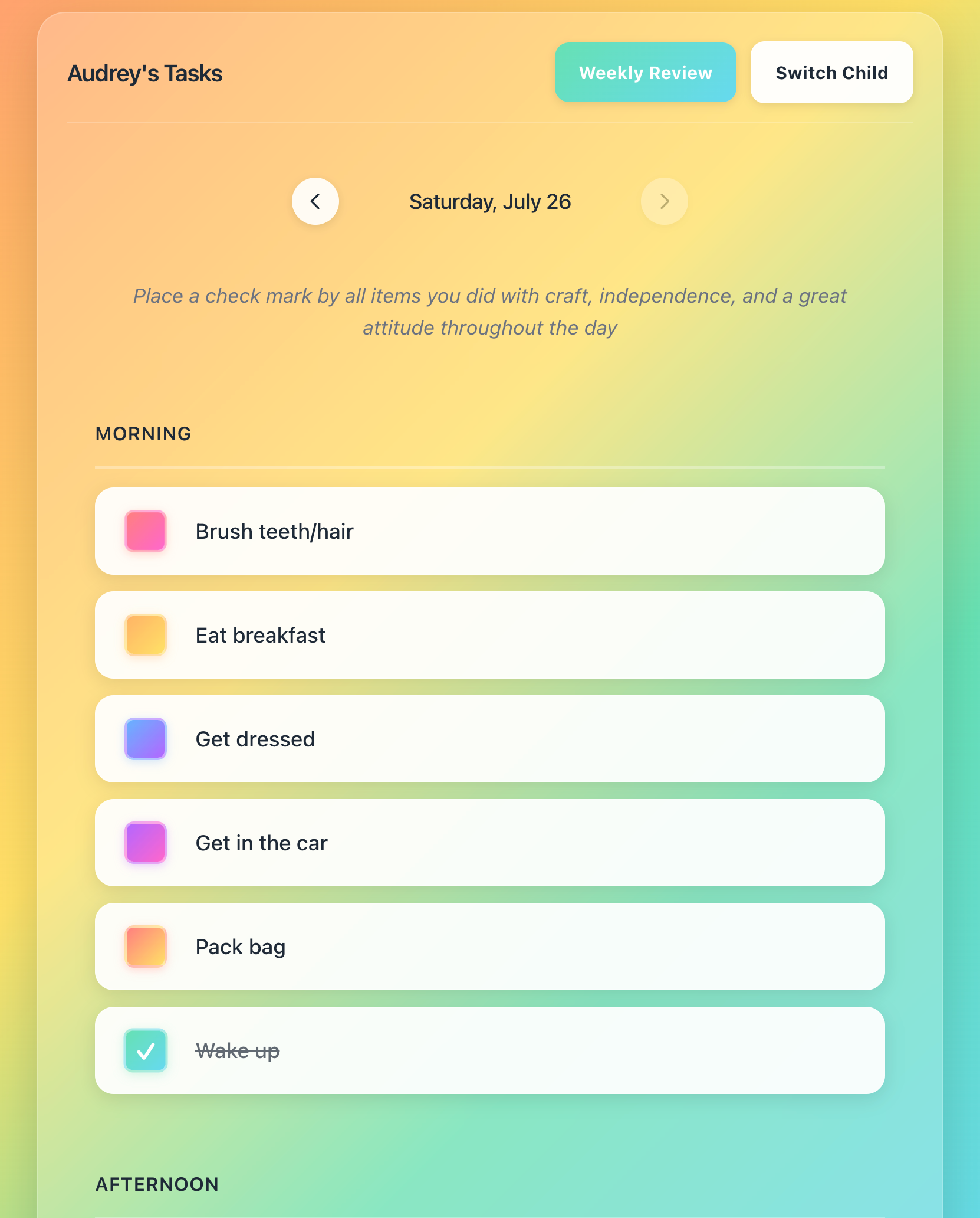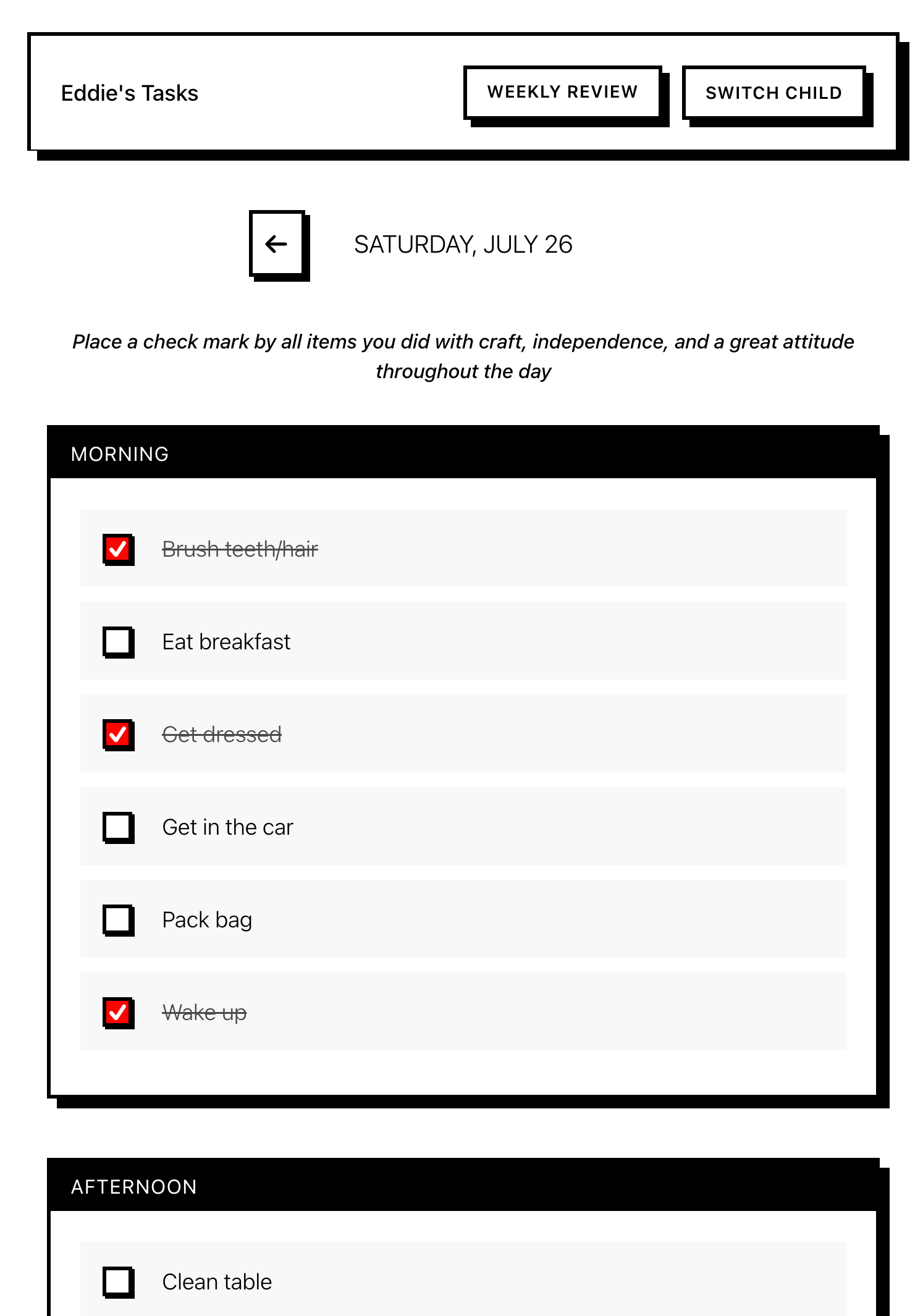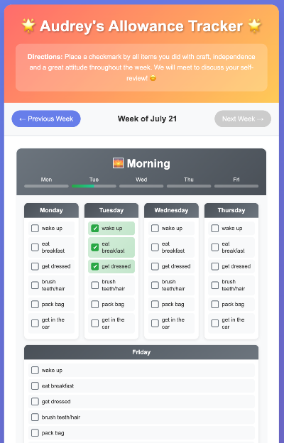 But wants have a way of being endless. What if the page refreshes? Both kids need different themed user interfaces. We need a review mode that can act as a conversation starter at the end of the week.