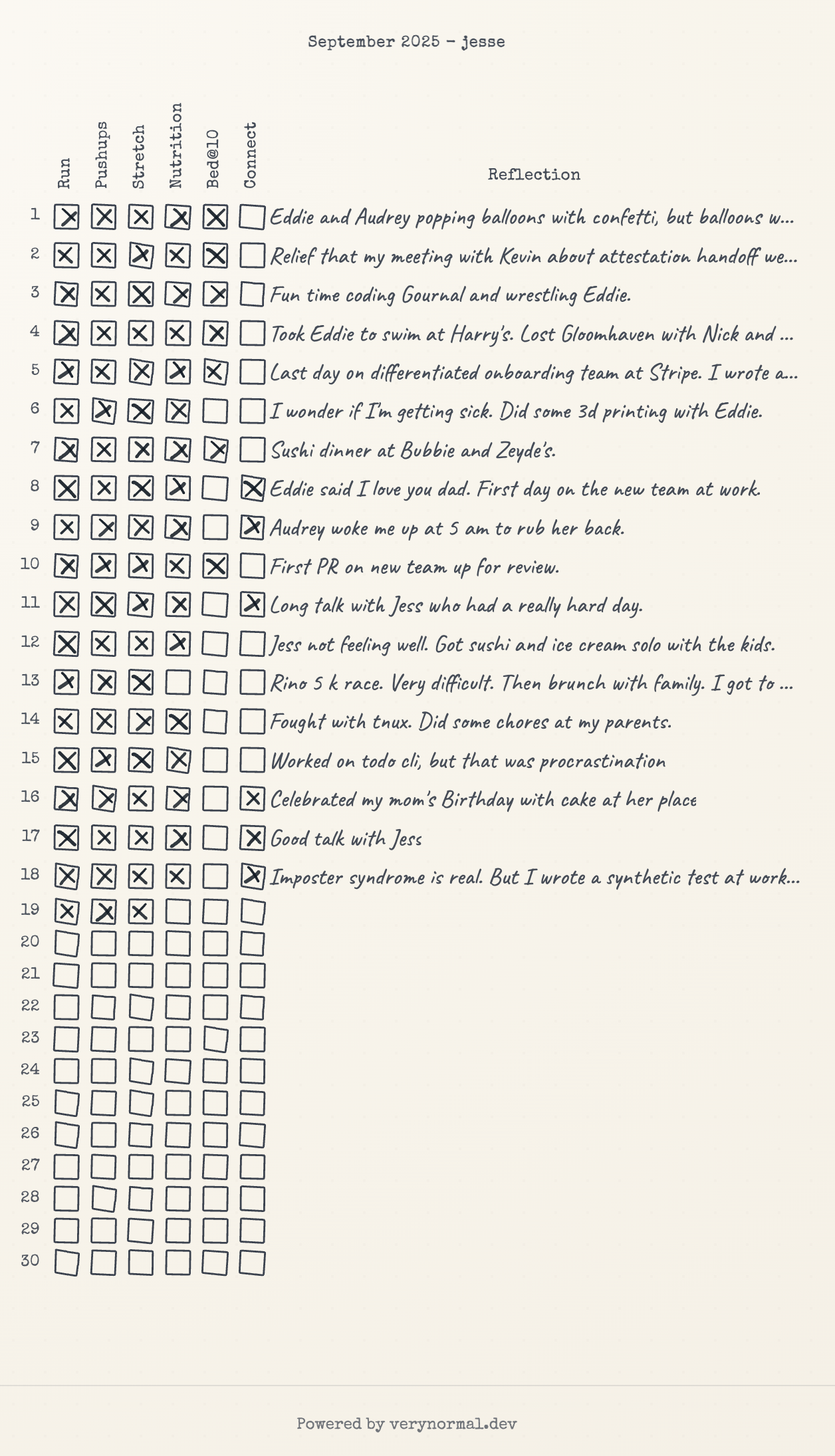 Want to share your progress? You can make your Gournal public with a custom URL. You can visit mine at verynormal.dev/jesse. You can share your habits, reflections or both.