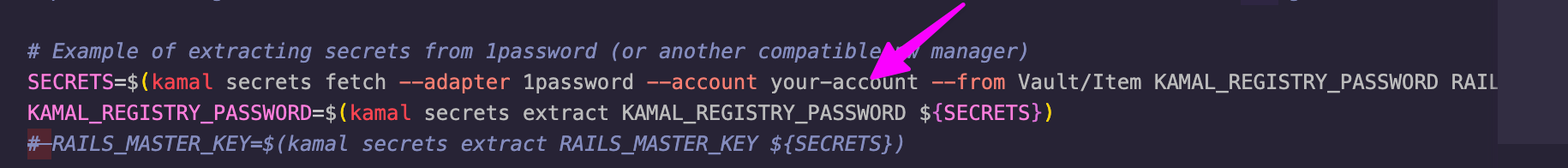 SECRETS=$(kamal secrets fetch --adapter 1password --account your-account --from Vault/Item KAMAL_REGISTRY_PASSWORD RAILS_MASTER_KEY)