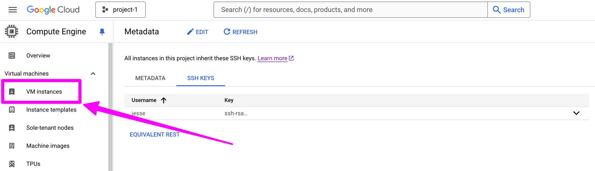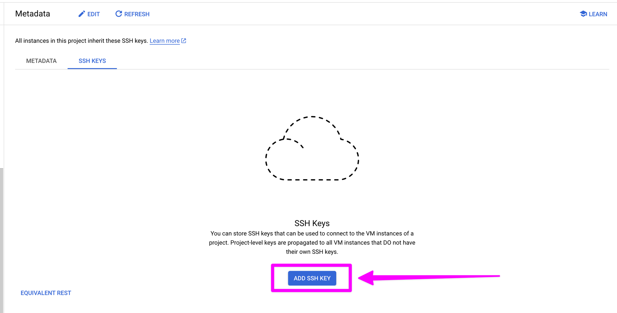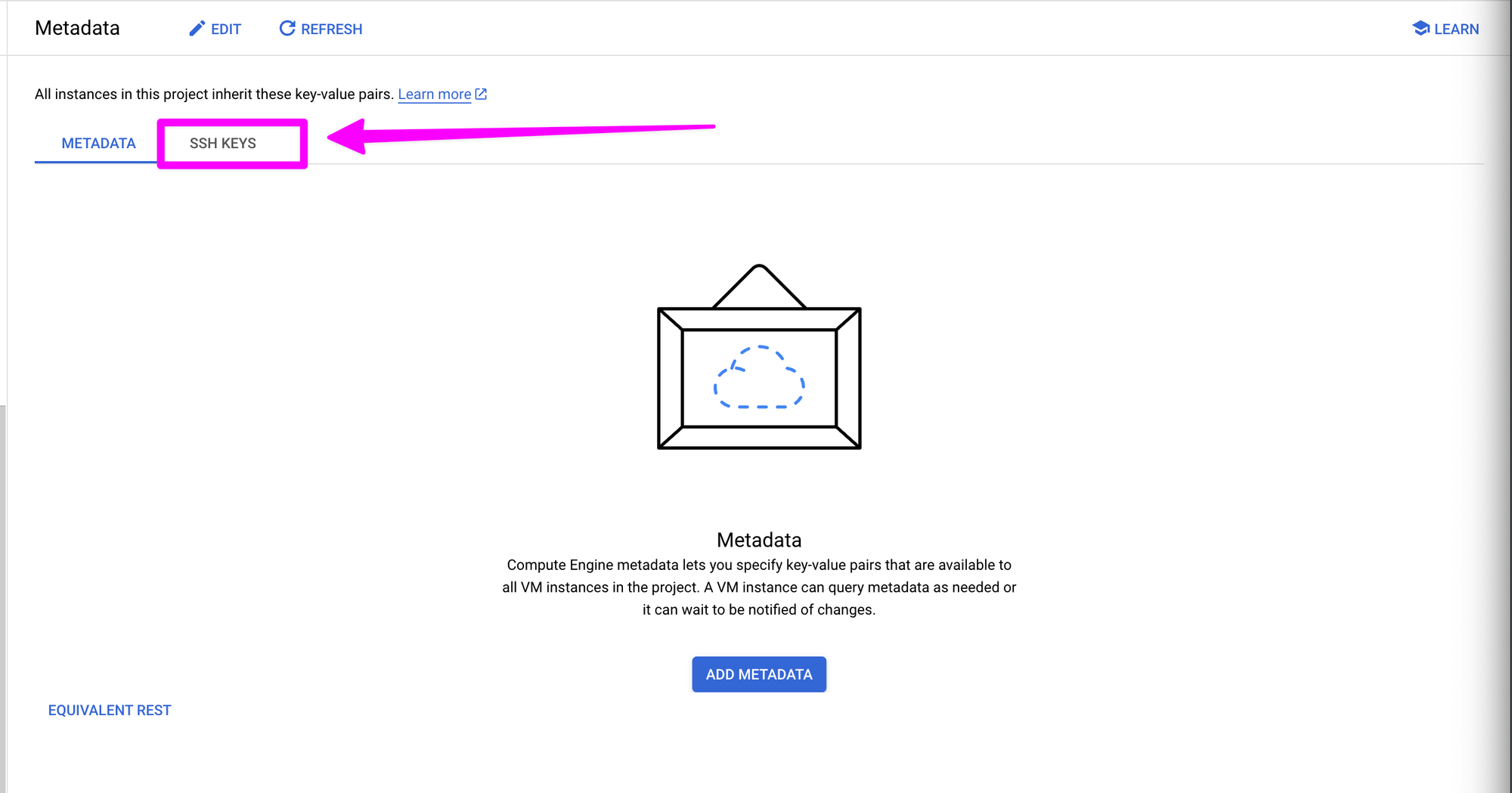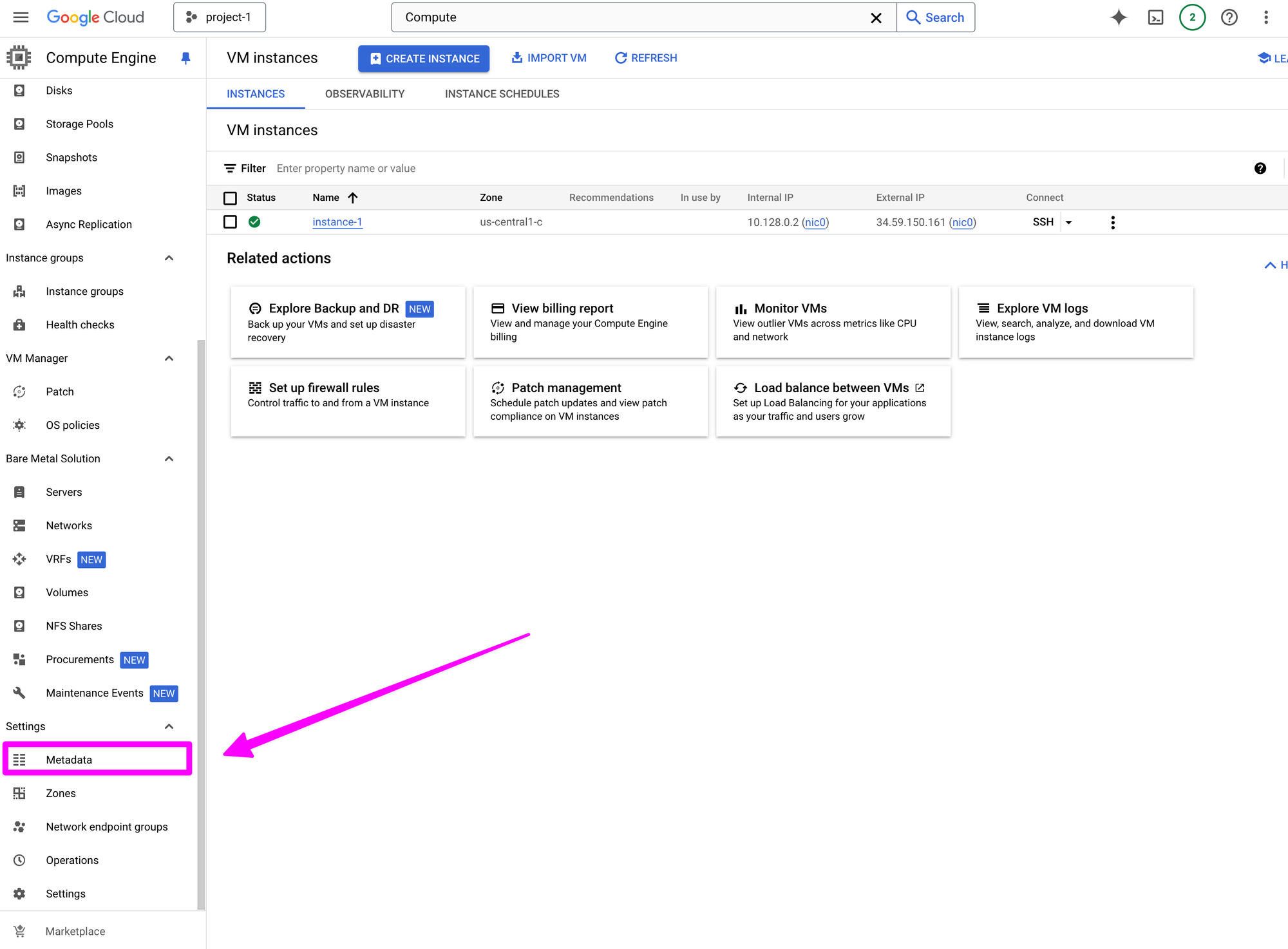 To add the SSH key to our VM, go to the "Metadata" link under "Settings."