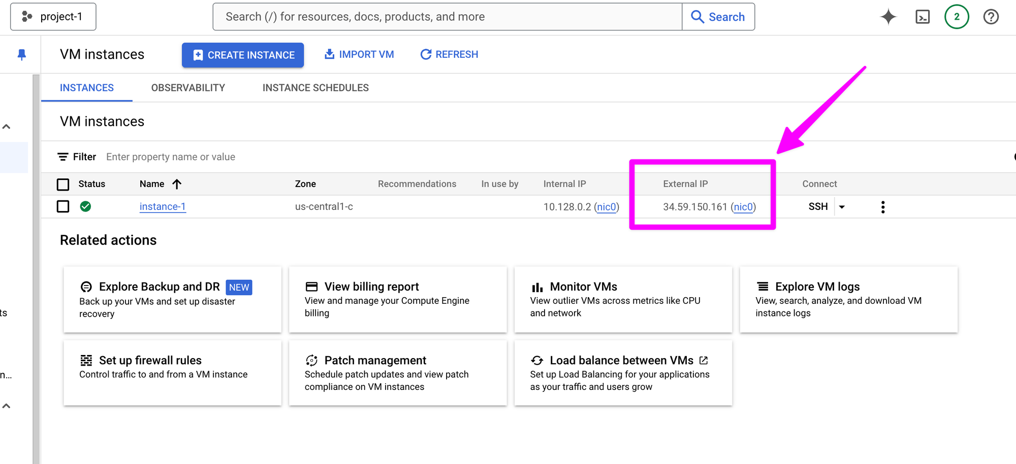 Back in the "VM instances" dashboard, note the External IP of the new instance. To continue the metaphor, this is the street address of the house onto which the lock was just installed. We will need the External IP address for later steps in this series.