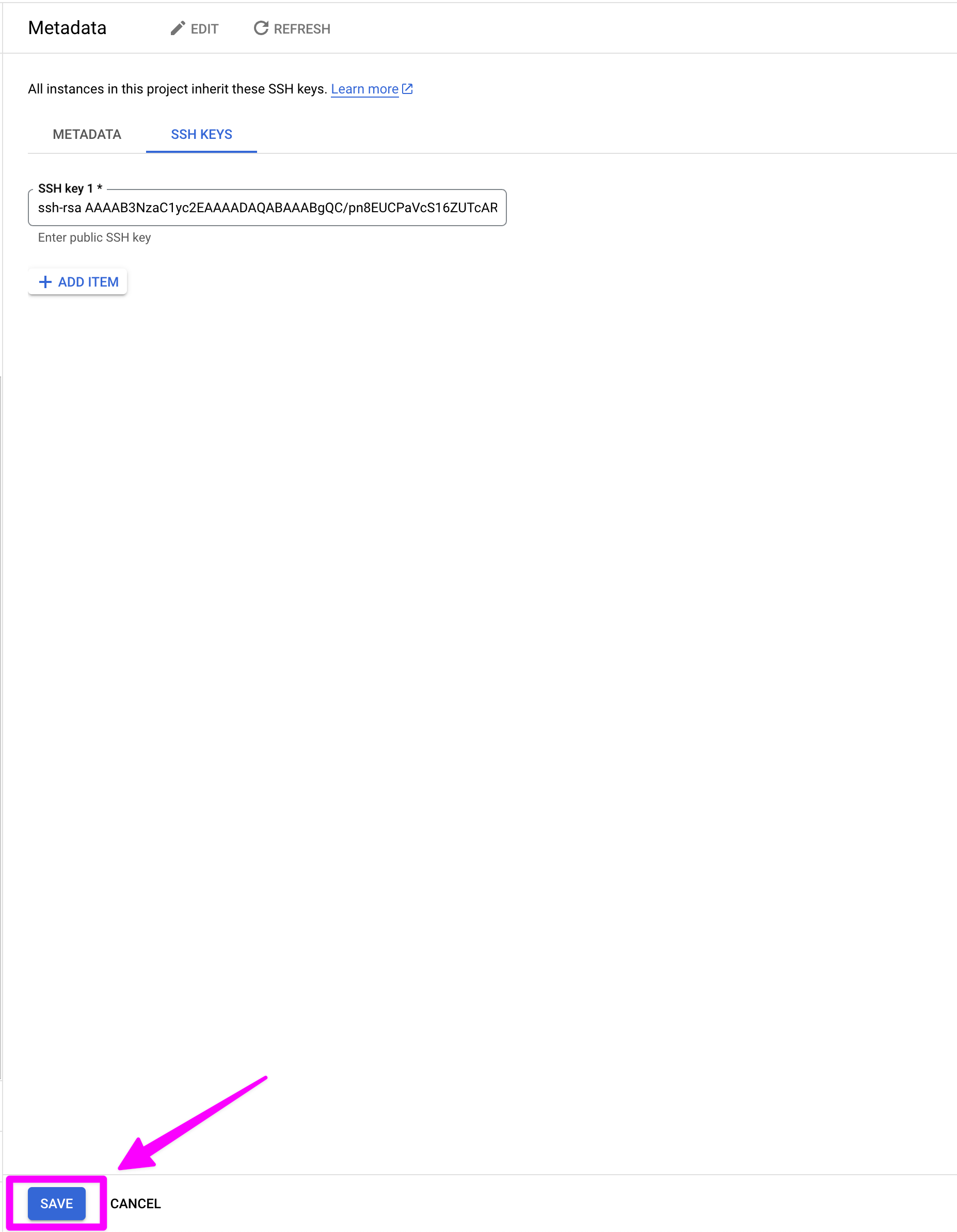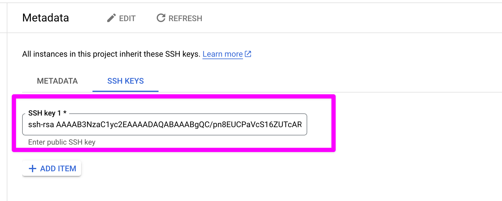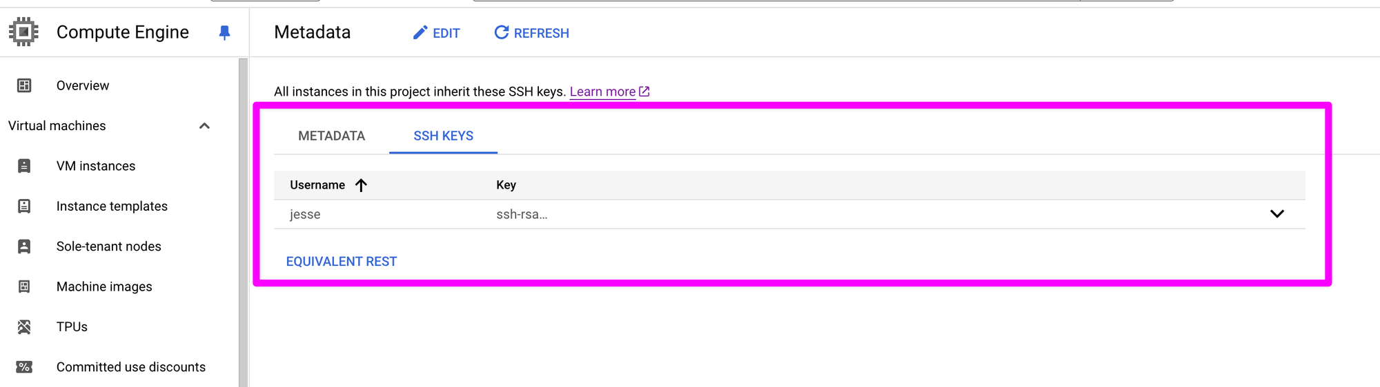 ssh-rsa AAAAB....asU= jesse@Jesses-Mac-Studio.localCopy the output (starting with ssh-rsa and ending with the username - in this case jesse@Jesses-Mac-Studio.local) and paste it into the GCP dashboard.