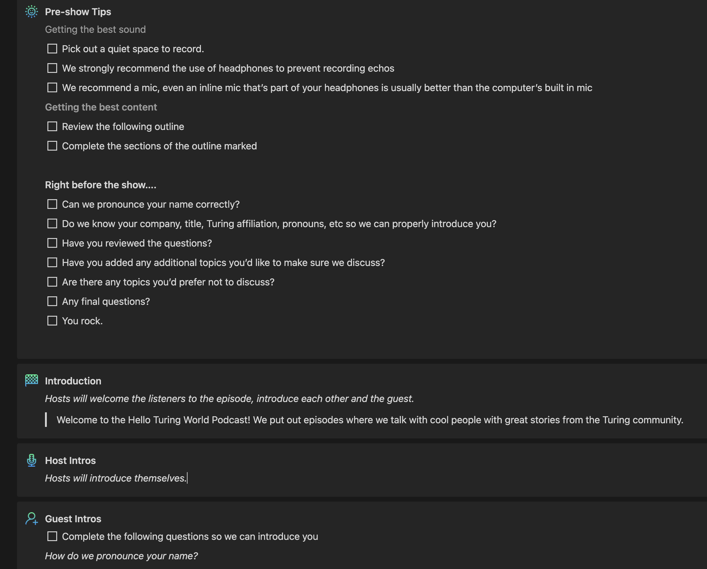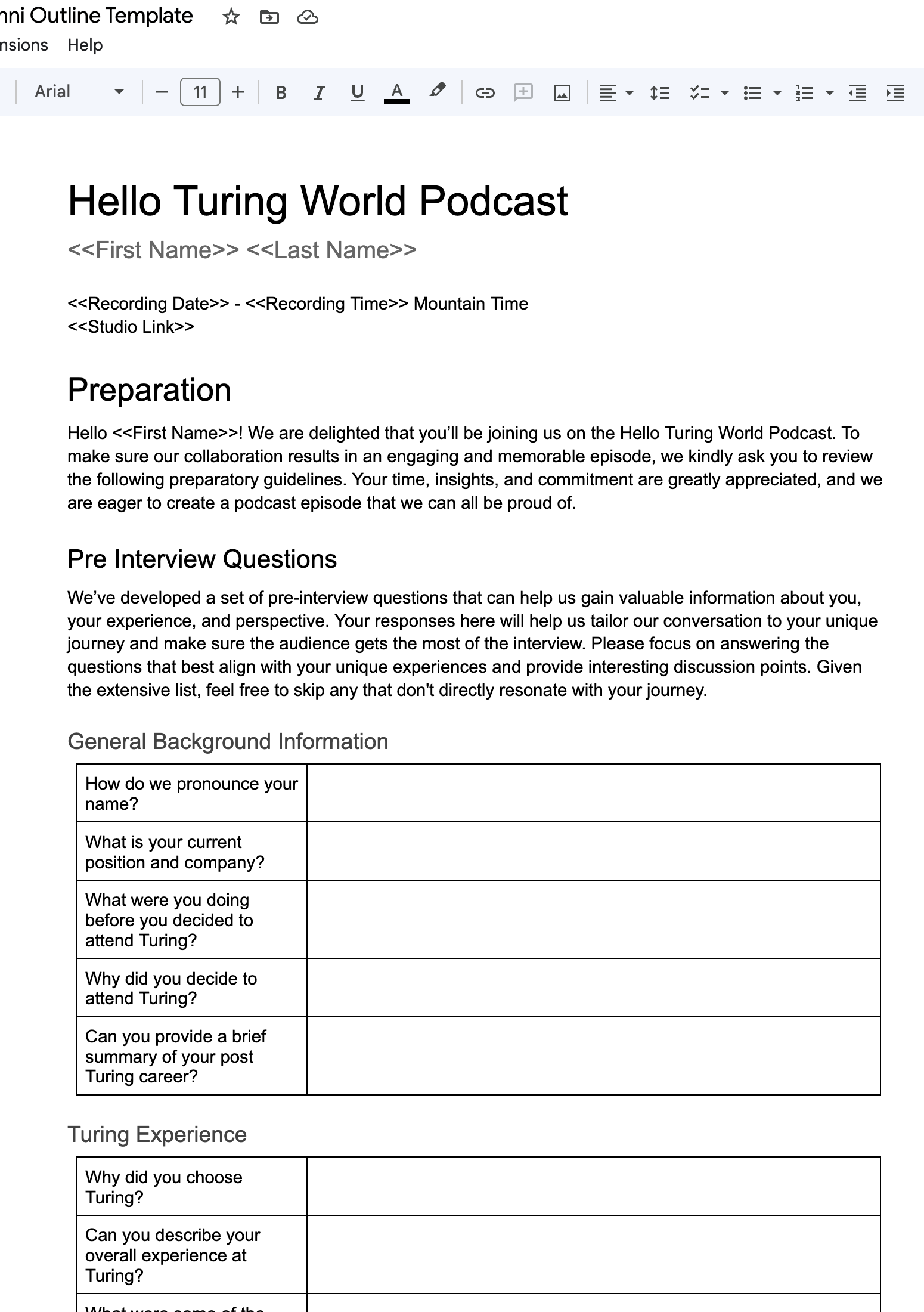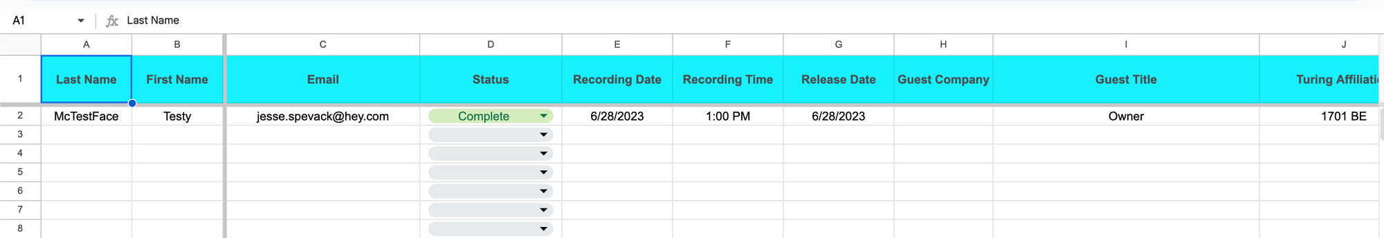 Some of you know I help run the Hello Turing World Podcast where we interview Turing Alumni and Staff. Recently I've migrated my systems for managing the podcast from Notion to Google Sheets.