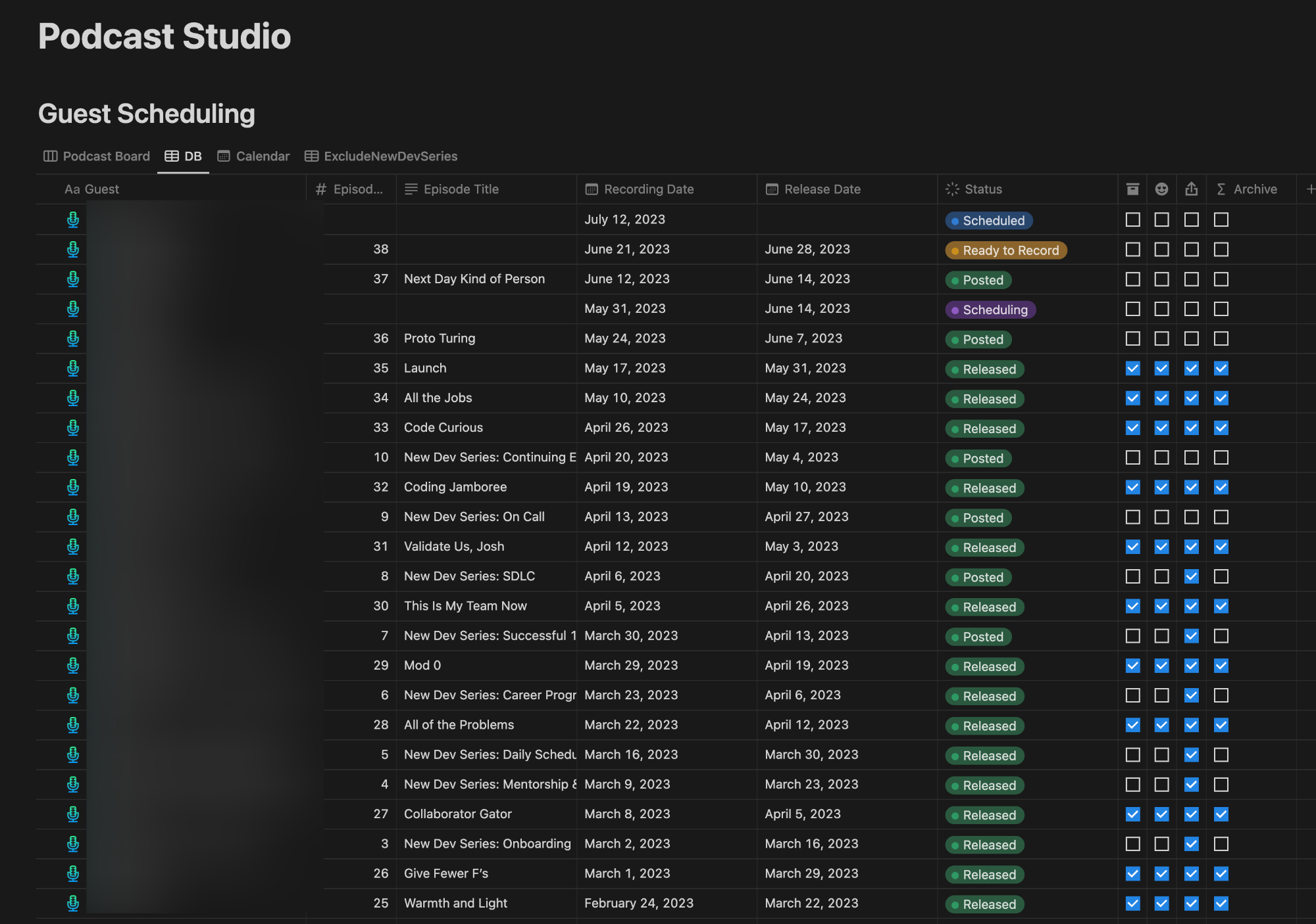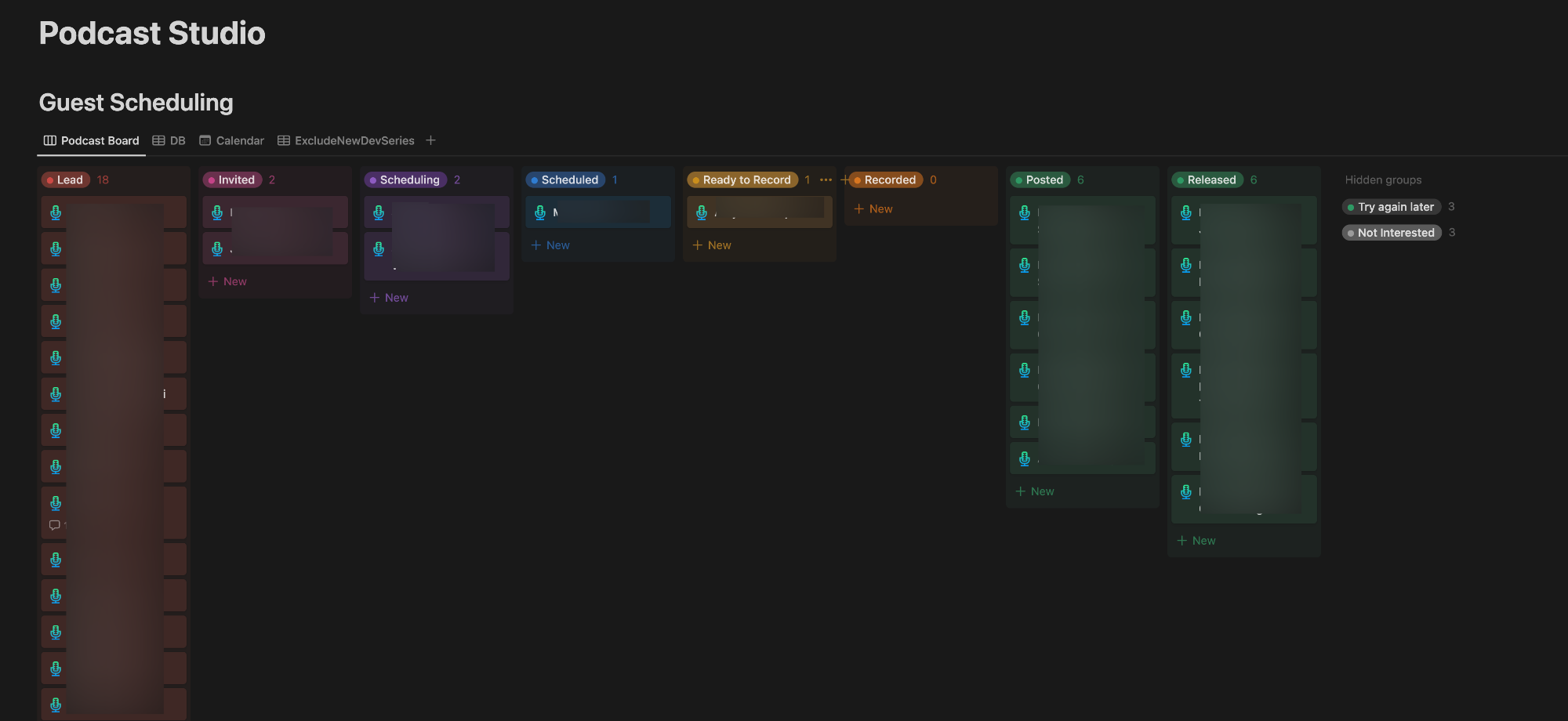 While this studio dashboard looks nice, it demands considerable effort. Every card on the board signifies a guest's journey in our podcast creation process, from prospect to episode launch. Each stage involves a mix of messages to send, events to plan, and audio to produce and edit.