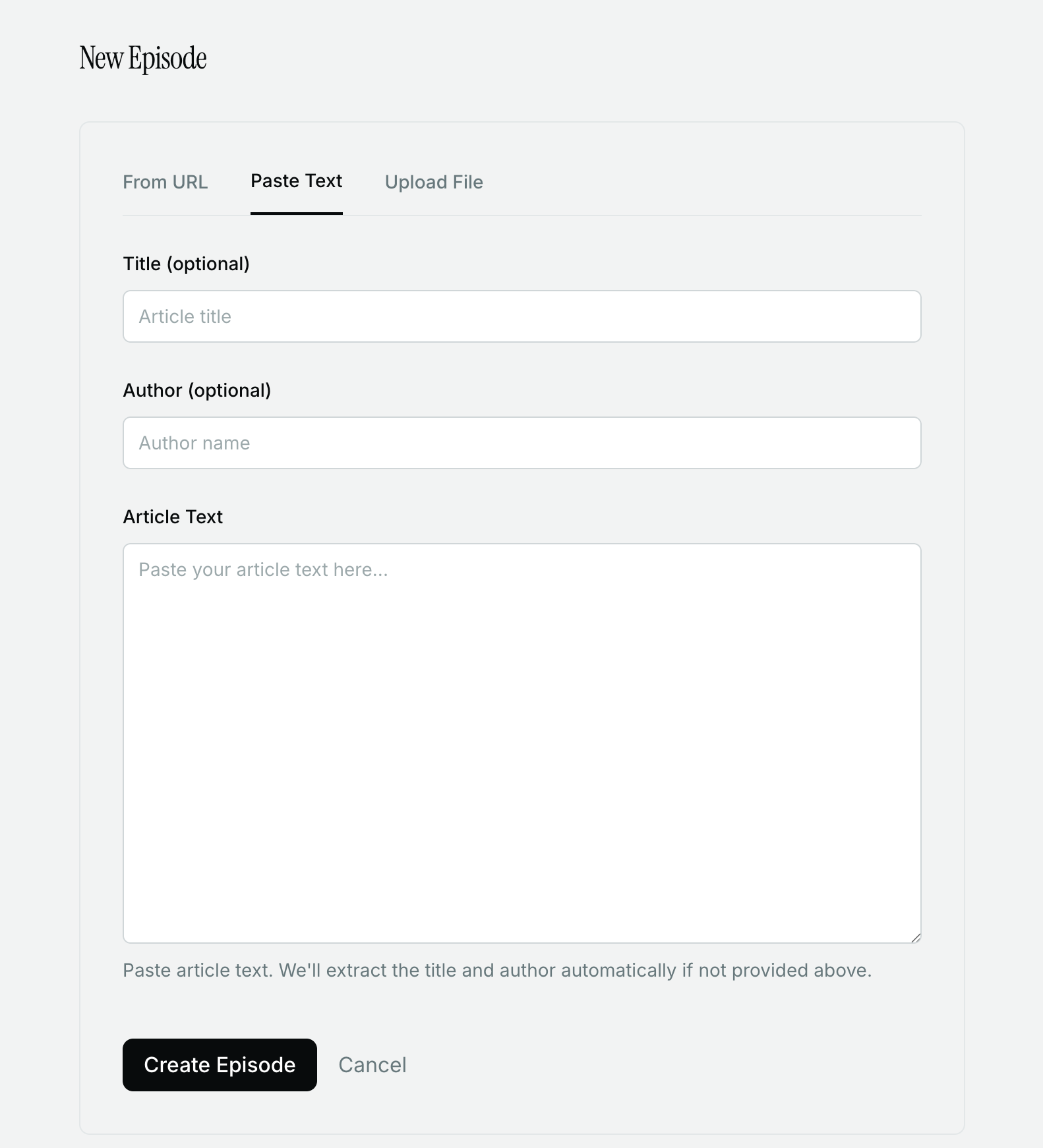 In PodRead, just click "+ New Episode" and select "Paste Text." You can turn any document into audio and listen to it later from your favorite podcast app whenever it is convenient.