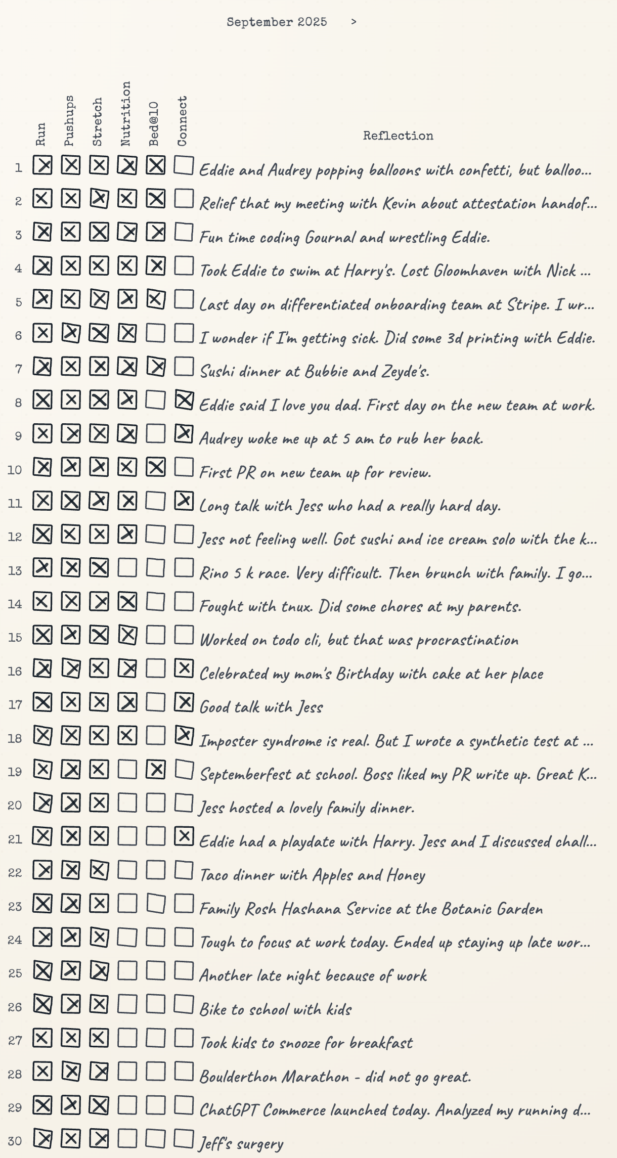I've been tracking daily habits and reflections with my new Gournal. I can say that I am very consistent with running, pushups and stretching. I was off to a good start with tracking my nutrition and getting to bed by 10pm.