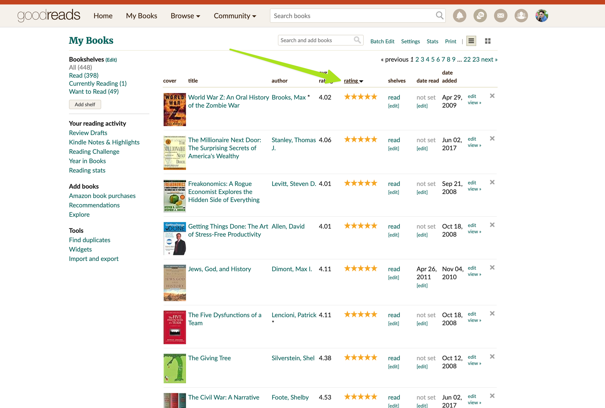 The Goodreads user experience leaves a lot to be desired. As far as I can tell, there is no easy way for me to see my top rated history books or my most read author. I can see my books sorted by rating and I'm sure there is some power user method involving shelves, but I don't have any interest in digging into.