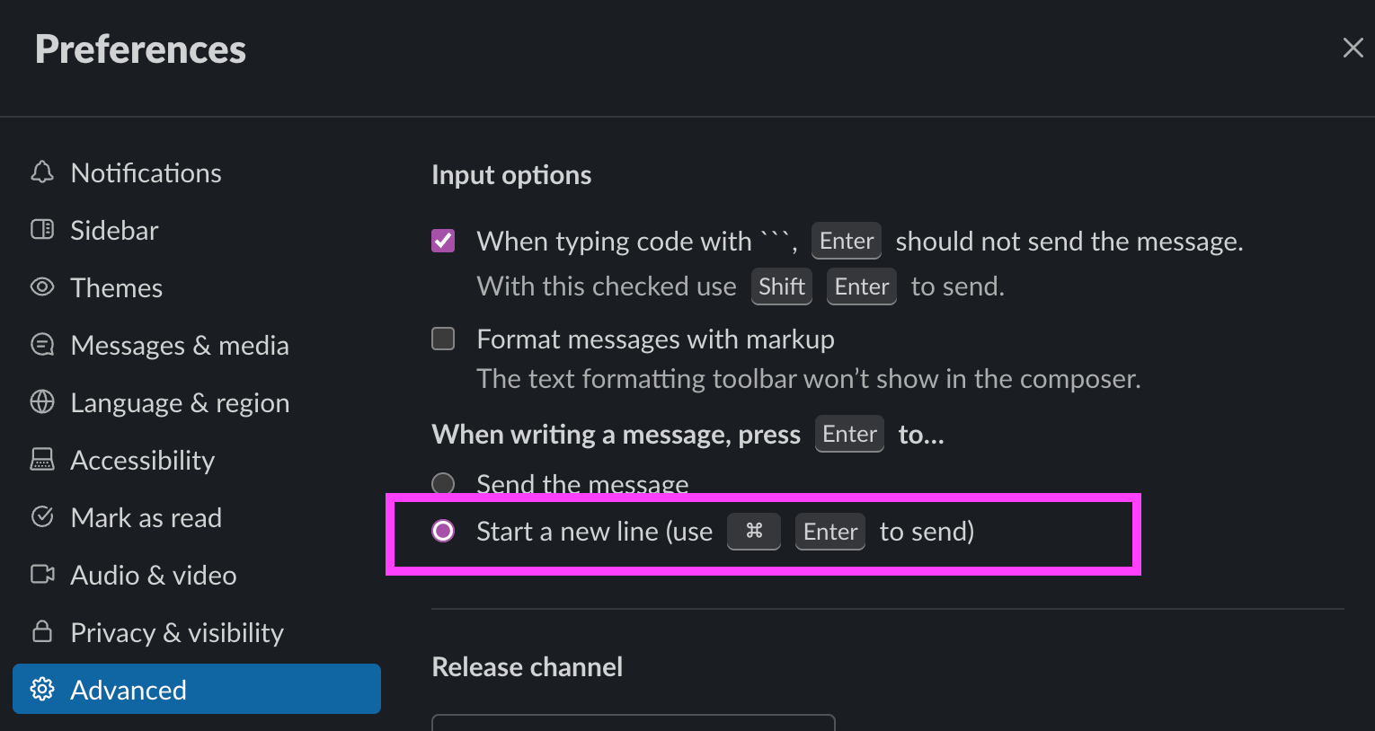 When writing a message, press 'Enter' to...option toStart a new line (use Cmd Enter to send).