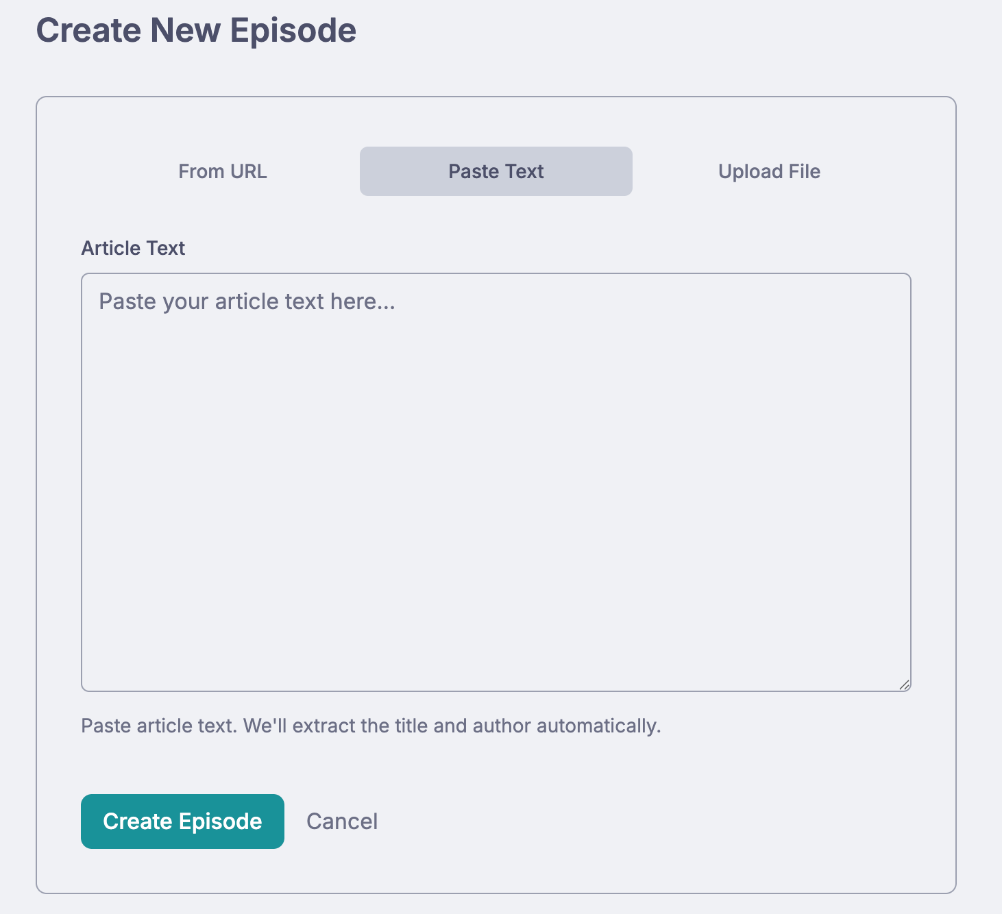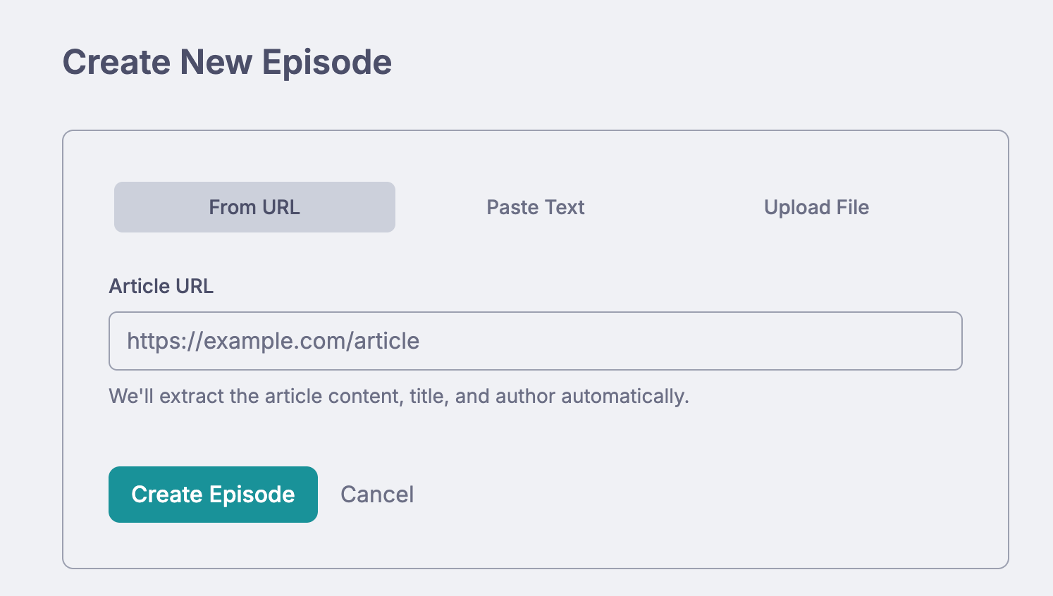 There are three ways to create episodes. The simplest is to paste a URL into the app. The tool fetches the content, strips out menus, sign-up buttons, and other clutter that wouldn't make sense as audio, and creates your episode. It will do its best to extract the title and author automatically.