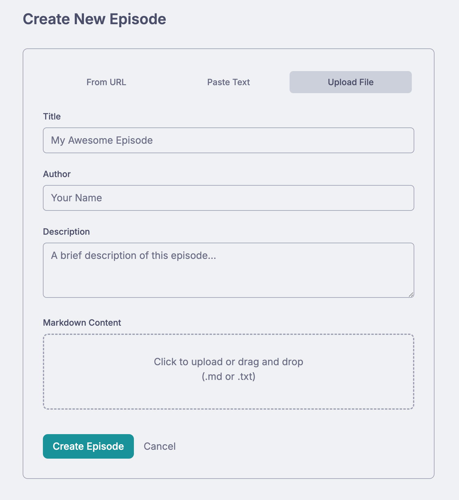 The third option is file upload, which is great for turning text and markdown files from your computer into episodes.