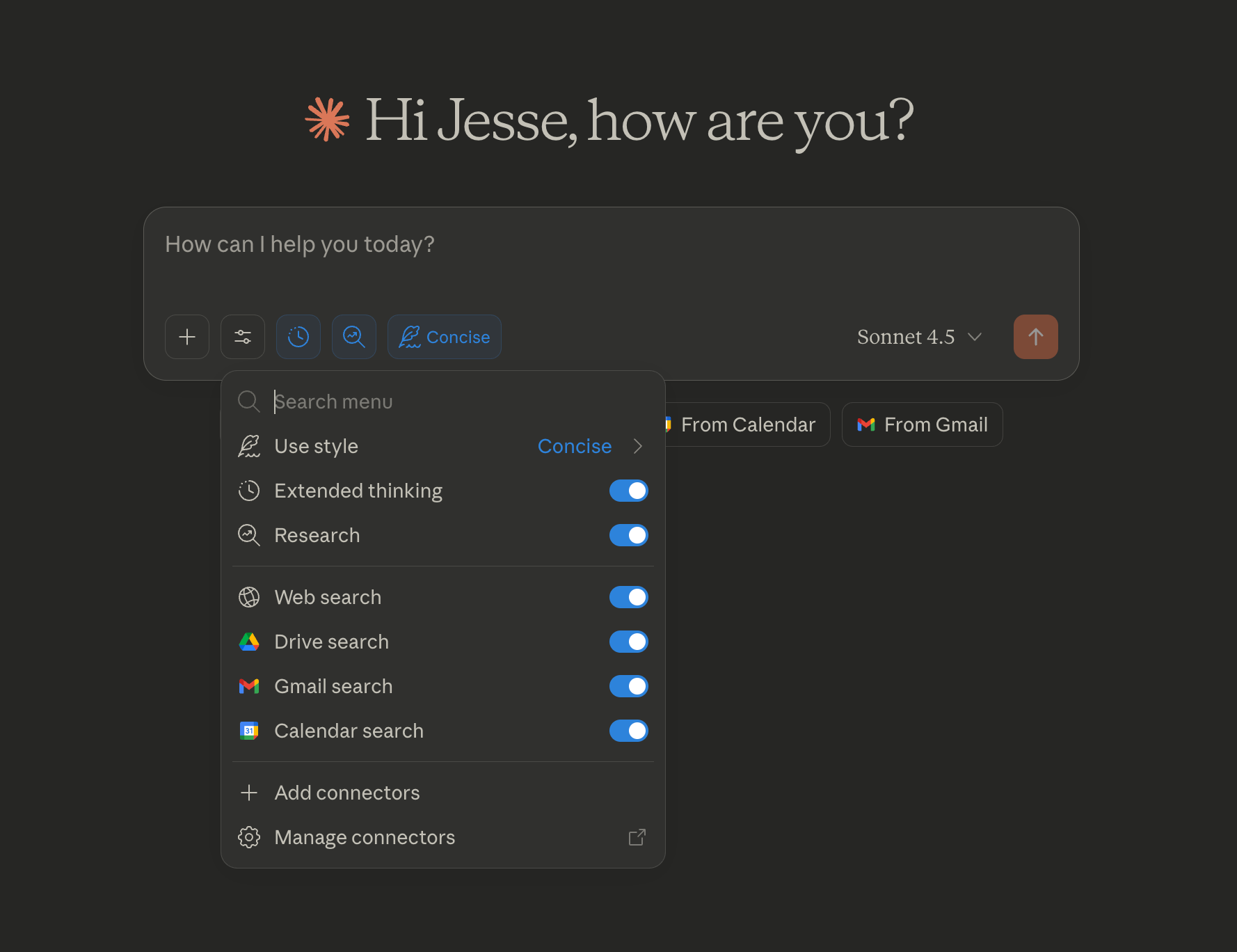Open claude.ai/new and make sure web search, research, and extended thinking are enabled. I prefer Claude's "Concise" style because I'm not an idiot.